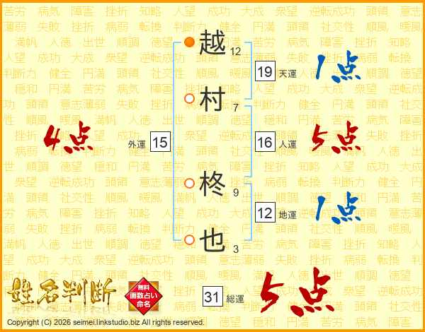 越村柊也さんの総運は31画の5点!