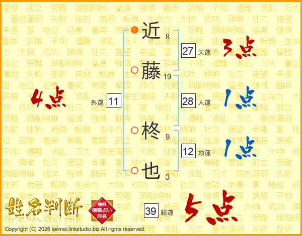 あなたの人生を表す1番重要な運勢です。生涯を通じて影響する総合運となり、主に50歳以降の晩年期に影響を及ぼします。苗字と名前の合計画数。