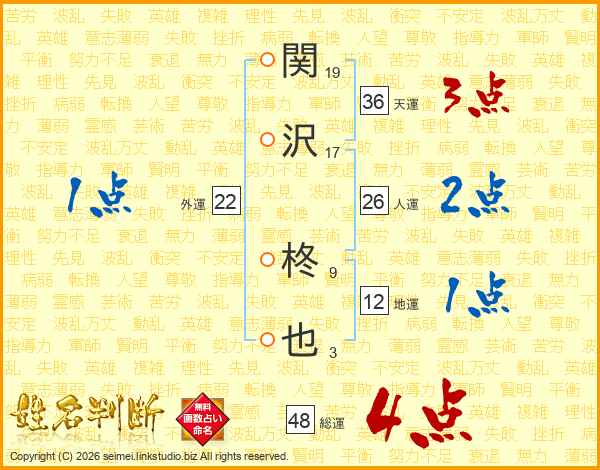 生活面を象徴する運勢です。外部から受ける影響力を表し、結婚運、家庭運や職場、環境への順応性を表します。総運から人運を引いた画数。姓や名が1文字の場合を除く。
