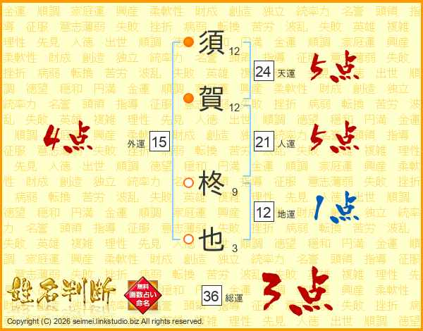 須(12画)賀(12画) 柊(9画)也(3画)