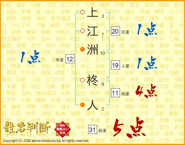 上(3画)江(7画)洲(10画) 柊(9画)人(2画)