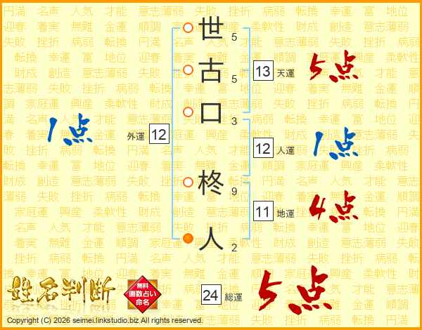 世(5画)古(5画)口(3画) 柊(9画)人(2画)