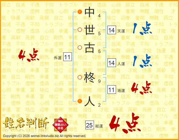 中(4画)世(5画)古(5画) 柊(9画)人(2画)