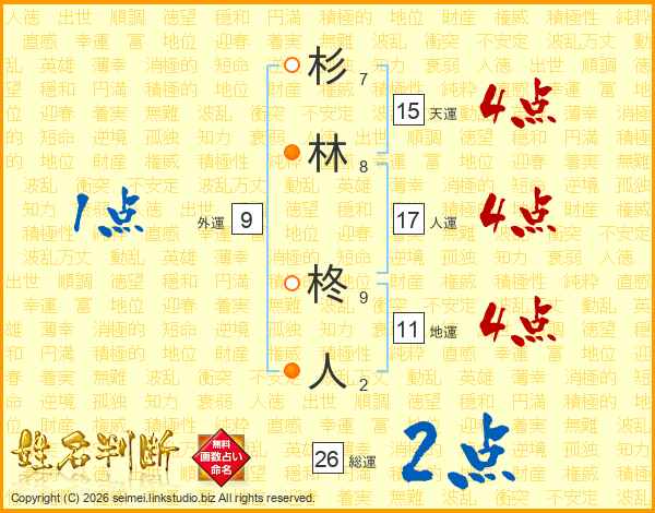 杉(7画)林(8画) 柊(9画)人(2画)