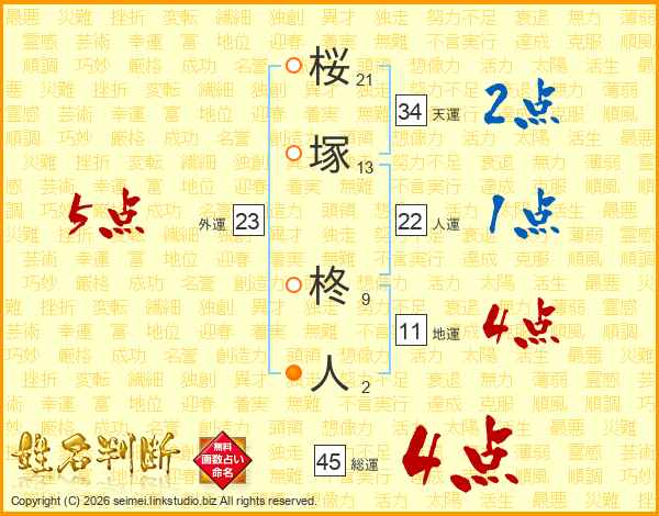 桜(21画)塚(13画) 柊(9画)人(2画)