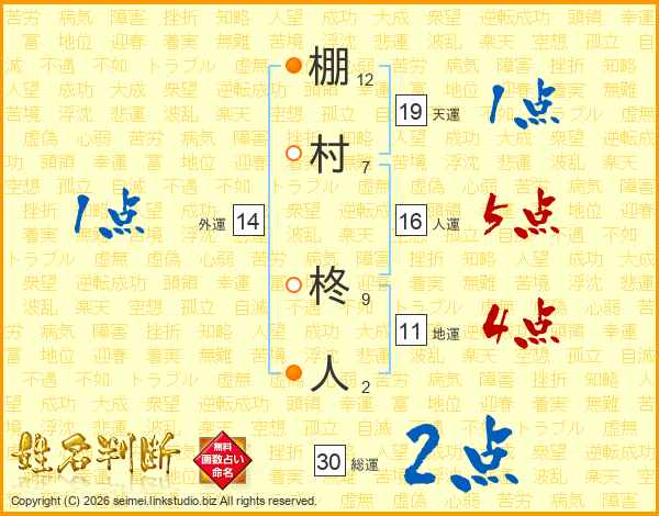 あなたの人生を表す1番重要な運勢です。生涯を通じて影響する総合運となり、主に50歳以降の晩年期に影響を及ぼします。苗字と名前の合計画数。