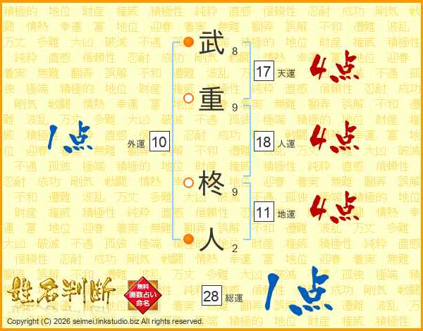 生活面を象徴する運勢です。外部から受ける影響力を表し、結婚運、家庭運や職場、環境への順応性を表します。総運から人運を引いた画数。姓や名が1文字の場合を除く。