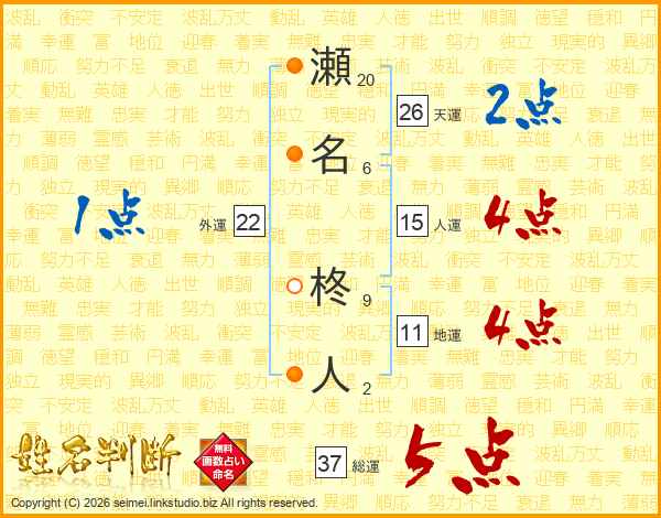 瀬名柊人さんの総運は37画の5点!
