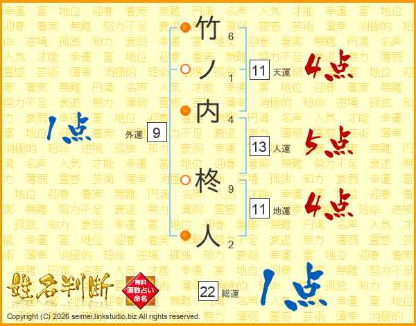 竹ノ内柊人さんの総運は22画の1点!