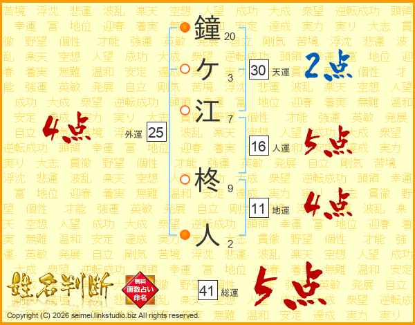 鐘(20画)ケ(3画)江(7画) 柊(9画)人(2画)