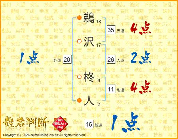 鵜(18画)沢(17画) 柊(9画)人(2画)