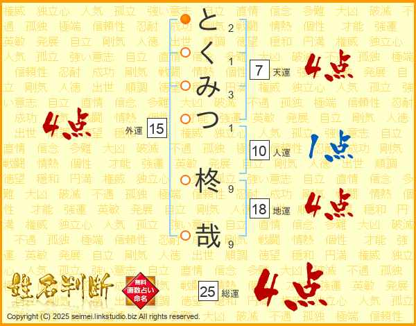 生活面を象徴する運勢です。外部から受ける影響力を表し、結婚運、家庭運や職場、環境への順応性を表します。総運から人運を引いた画数。姓や名が1文字の場合を除く。