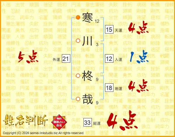 寒川柊哉さんの総運は33画の4点!