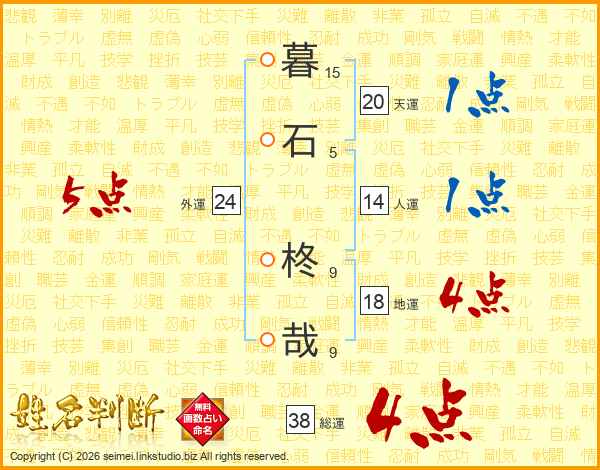 暮(15画)石(5画) 柊(9画)哉(9画)