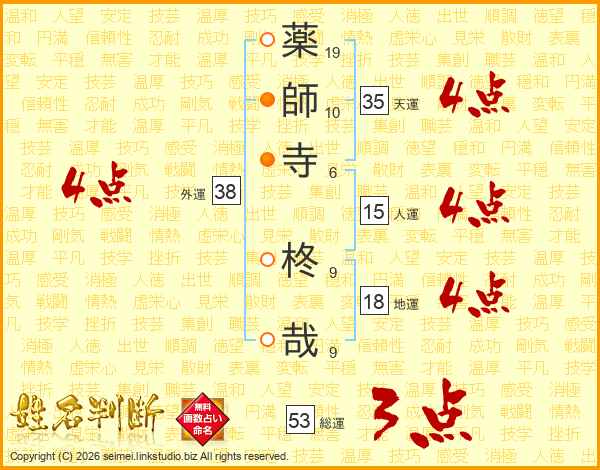 薬師寺柊哉さんの外運は38画の4点!