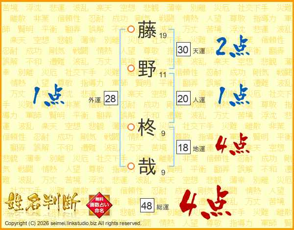 藤(19画)野(11画) 柊(9画)哉(9画)