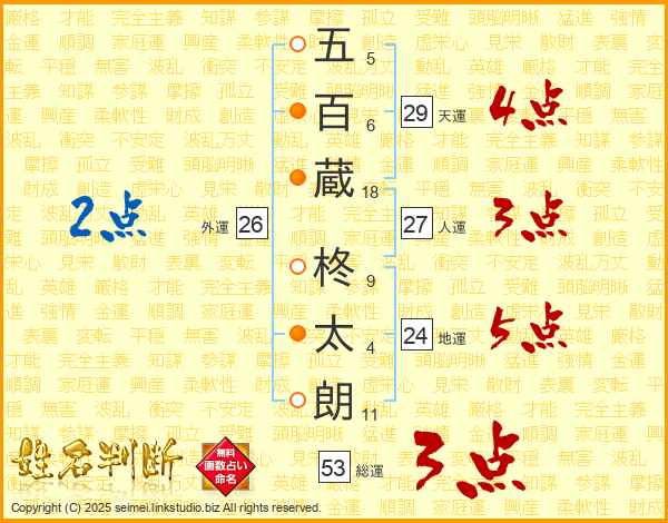 五(5画)百(6画)蔵(18画) 柊(9画)太(4画)朗(11画)