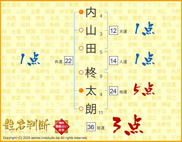 内(4画)山(3画)田(5画) 柊(9画)太(4画)朗(11画)