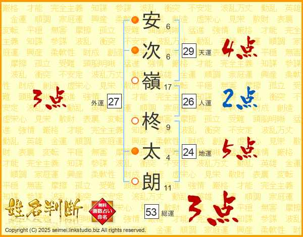 安(6画)次(6画)嶺(17画) 柊(9画)太(4画)朗(11画)