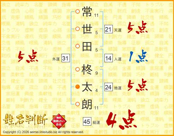 常(11画)世(5画)田(5画) 柊(9画)太(4画)朗(11画)