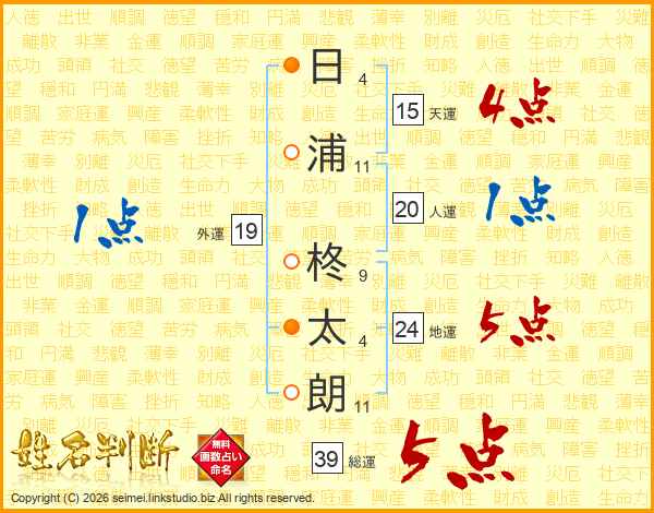 日(4画)浦(11画) 柊(9画)太(4画)朗(11画)