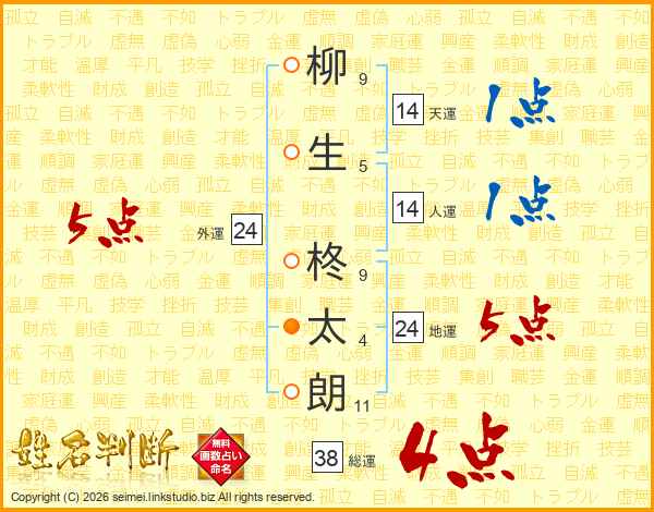 柳(9画)生(5画) 柊(9画)太(4画)朗(11画)
