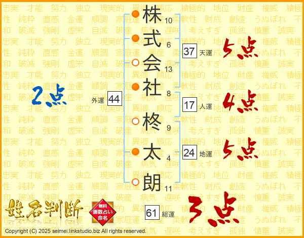 株(10画)式(6画)会(13画)社(8画) 柊(9画)太(4画)朗(11画)