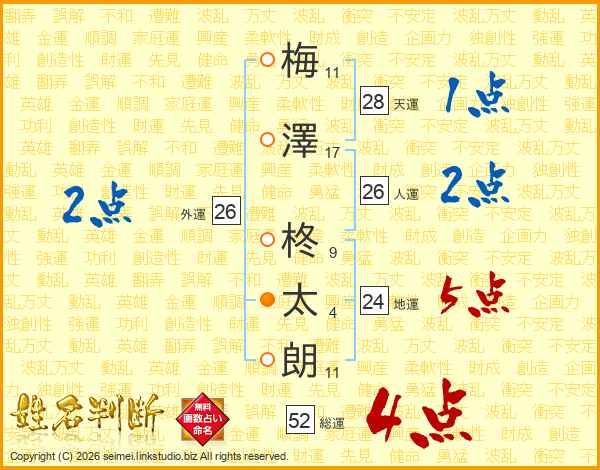 梅(11画)澤(17画) 柊(9画)太(4画)朗(11画)