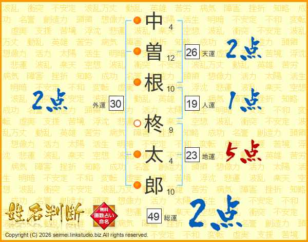中(4画)曽(12画)根(10画) 柊(9画)太(4画)郎(10画)