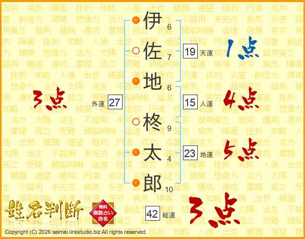 伊(6画)佐(7画)地(6画) 柊(9画)太(4画)郎(10画)