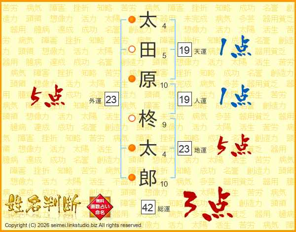 太(4画)田(5画)原(10画) 柊(9画)太(4画)郎(10画)