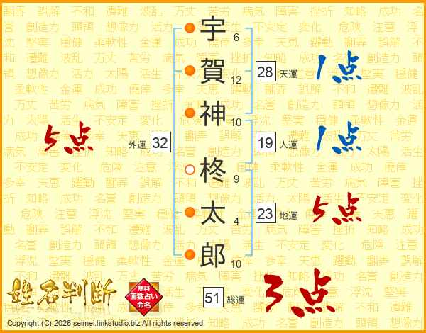 宇賀神柊太郎さんの外運は32画の5点!