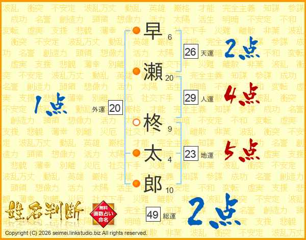 早(6画)瀬(20画) 柊(9画)太(4画)郎(10画)