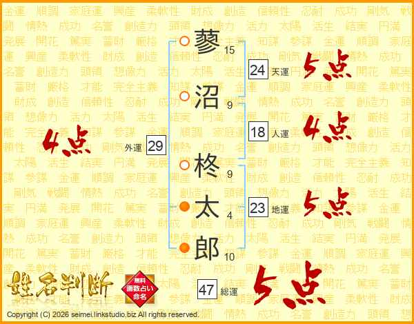 蓼(15画)沼(9画) 柊(9画)太(4画)郎(10画)