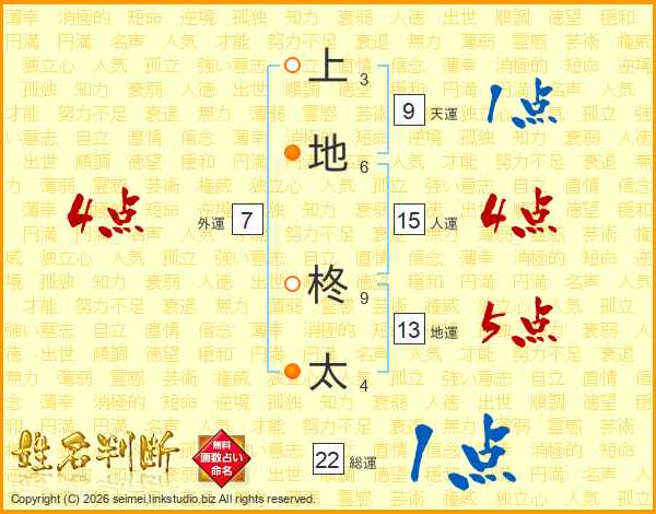 生活面を象徴する運勢です。外部から受ける影響力を表し、結婚運、家庭運や職場、環境への順応性を表します。総運から人運を引いた画数。姓や名が1文字の場合を除く。
