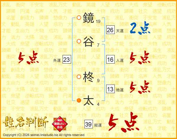 鏡谷柊太さんの総運は39画の5点!