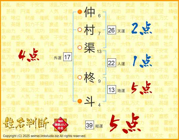生活面を象徴する運勢です。外部から受ける影響力を表し、結婚運、家庭運や職場、環境への順応性を表します。総運から人運を引いた画数。姓や名が1文字の場合を除く。