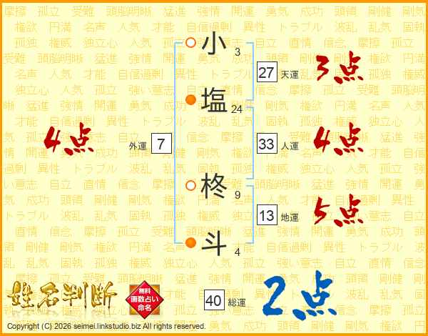 小(3画)塩(24画) 柊(9画)斗(4画)