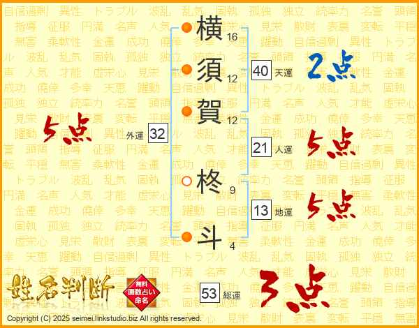 横(16画)須(12画)賀(12画) 柊(9画)斗(4画)
