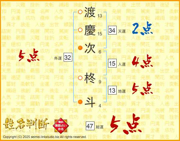 渡(13画)慶(15画)次(6画) 柊(9画)斗(4画)