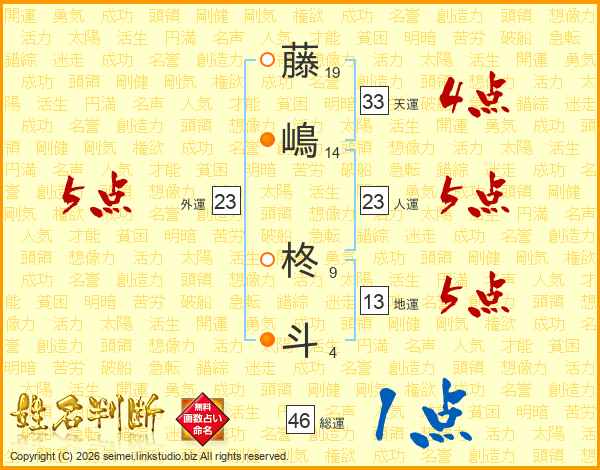 藤(19画)嶋(14画) 柊(9画)斗(4画)