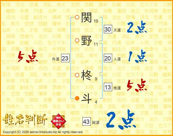 関(19画)野(11画) 柊(9画)斗(4画)