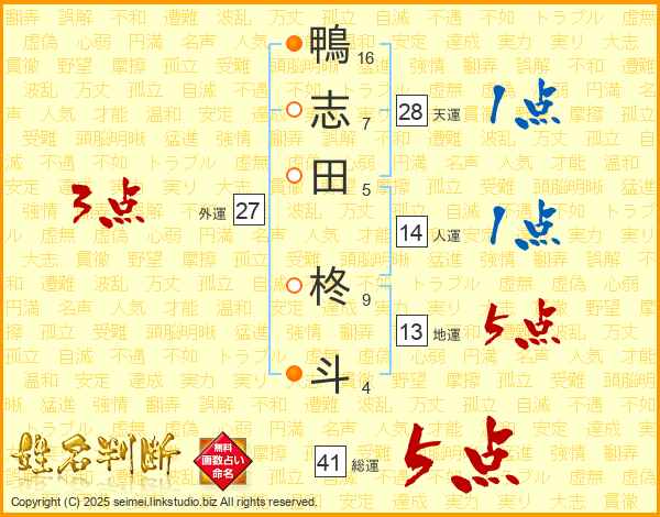 鴨(16画)志(7画)田(5画) 柊(9画)斗(4画)