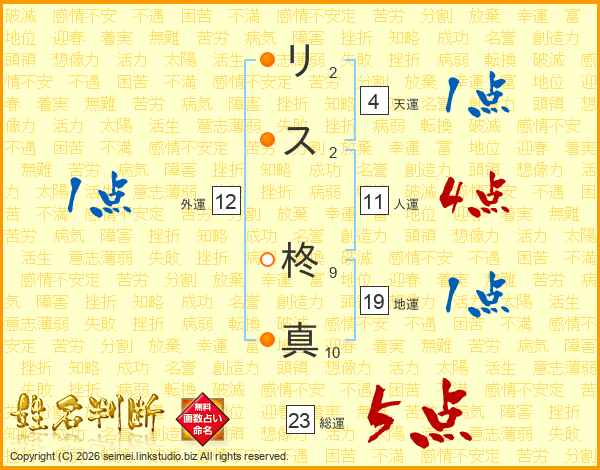 リ(2画)ス(2画) 柊(9画)真(10画)