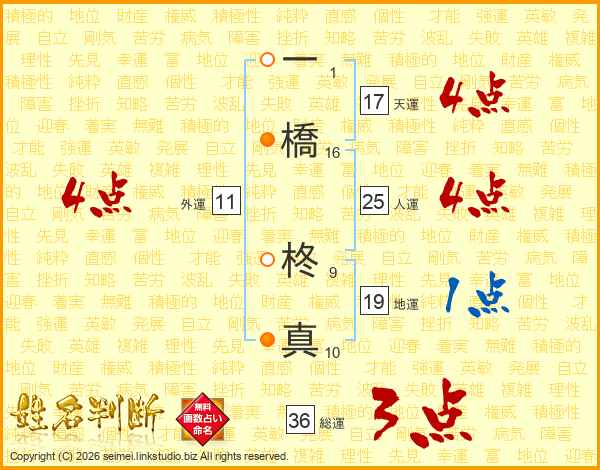 一(1画)橋(16画) 柊(9画)真(10画)