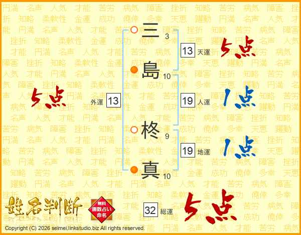 あなたの人生を表す1番重要な運勢です。生涯を通じて影響する総合運となり、主に50歳以降の晩年期に影響を及ぼします。苗字と名前の合計画数。