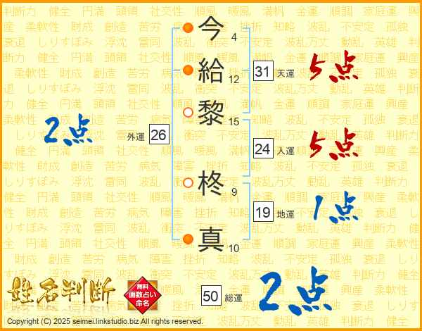 今(4画)給(12画)黎(15画) 柊(9画)真(10画)