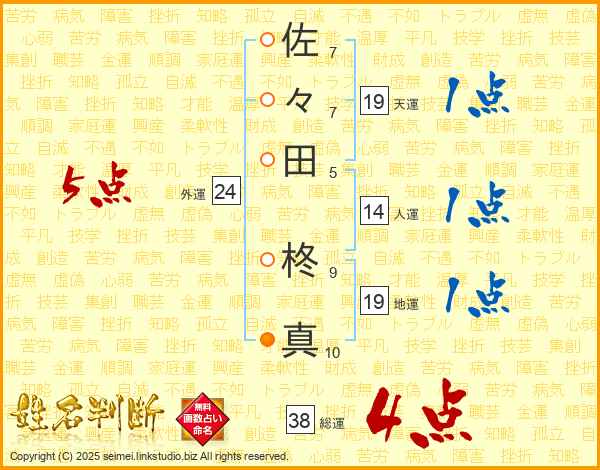 佐(7画)々(7画)田(5画) 柊(9画)真(10画)