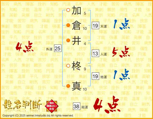 加(5画)倉(10画)井(4画) 柊(9画)真(10画)