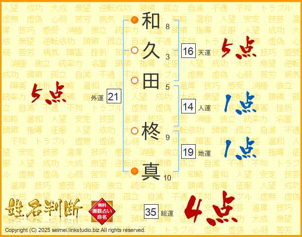 和(8画)久(3画)田(5画) 柊(9画)真(10画)